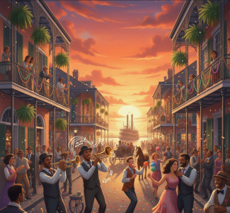 The city awakens in the glow of evening, with music spilling from every street corner and the energy of New Orleans filling the air. French Quarter architecture, street performers, and festive scenes paint a vivid picture of life along the Mississippi. The show is a journey through the heart of a city where every sunset brings music, movement, and magic.